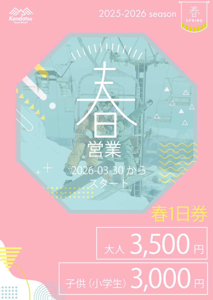 2025/26シーズン 営業終了日のお知らせいつもご来場誠にありがとうございます。 2026年「4月 7日(火)17:00」をもって営業終了予定となります。例年より、まだ良い条件で滑走する事が出来ますが、融雪の進み具合今 […]